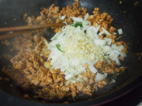 파에서 향이 오르기 시작하면 고기 넣고 볶아주다가, 고기가 다 풀어졌으면