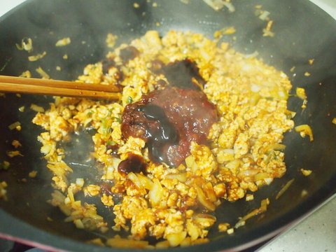 양파도 어느정도 익었으면, 두반장 1큰술, 굴소스 2큰술 넣고 볶습니다.