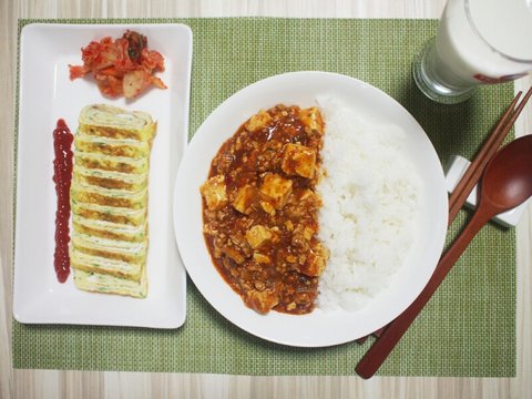 매콤한 마파두부와 부드러운 계란말이가 어우러진 맛있는 한끼입니다.