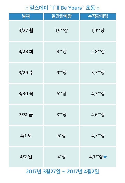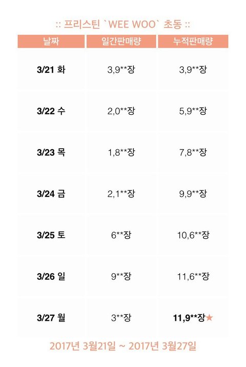 내가 가지고 있는게 걸데랑 프리스틴 컴백주 초동 판매량 표인데