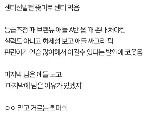 난 인기멤버 다 가져간건 그럴수 있다고 생각하는데, 마지막에 남은 애들은 이유가 있어~ 이런식으로 사람 무시한게 진짜 정떨어짐.. 실력으로 무시했다고 하기에는 자기가 뽑은 애들중에 F반 애들 있는데 걔들 다 팬덤 꽤 있고 인기 많은애들임.. 이대휘는 실력으로 사람평가하는걸 넘어서 그냥 다른 연습생들을 인기등급나눠서 깔아본거