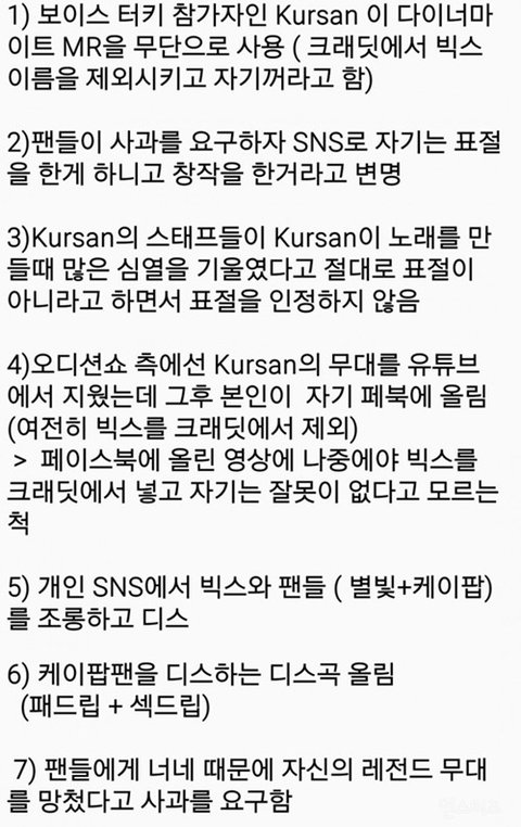 다이너마이트 뿐만이 아니라 중국에서 빅스가 했던 퍼포먼스, 노래, 의상 그대로 가져다가 공연했던 사건도 있었고 최근에 프듀에서 한 연습생이 엔의 콘서트 개인무대 안무를 말도 없이 가져다 자기Pr에 사용했었던 일도 있어서 더 화난다.이렇게 많은 도용사건이 있었는데도 아무런 대응이 없는 소속사도 너무 화나고