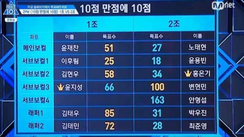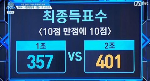 - 그런데 프로듀스 측은 평균 점수로 계산하지않고 총 점수를 합산한 값으로 결과를 냄 . 1조에겐 굉장히 불리 ( 투표 일인분 증발과 같음 ; )