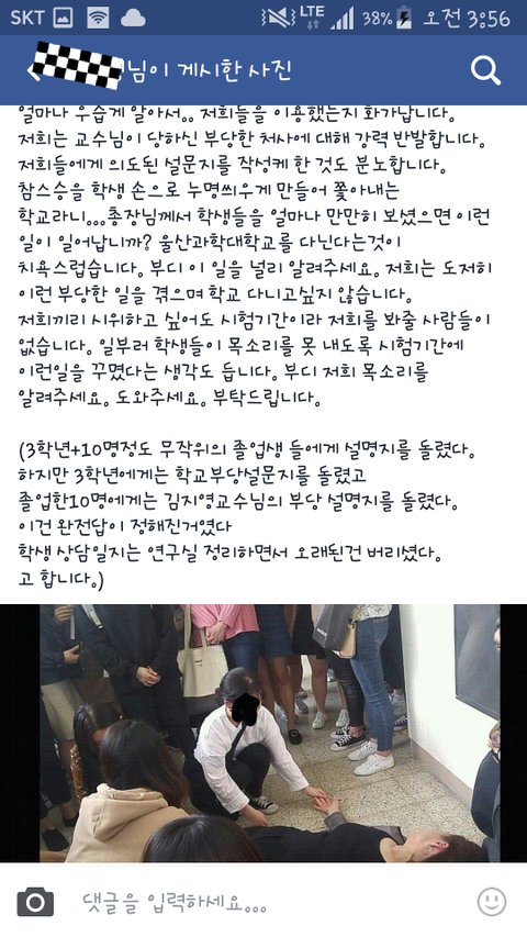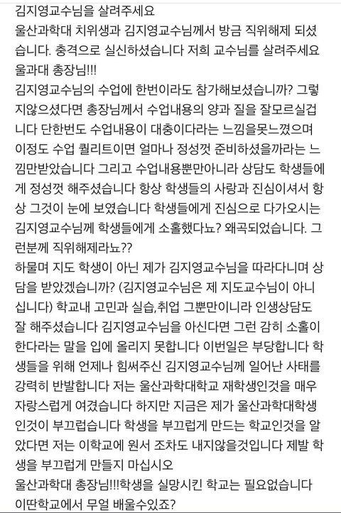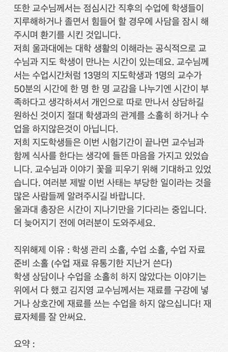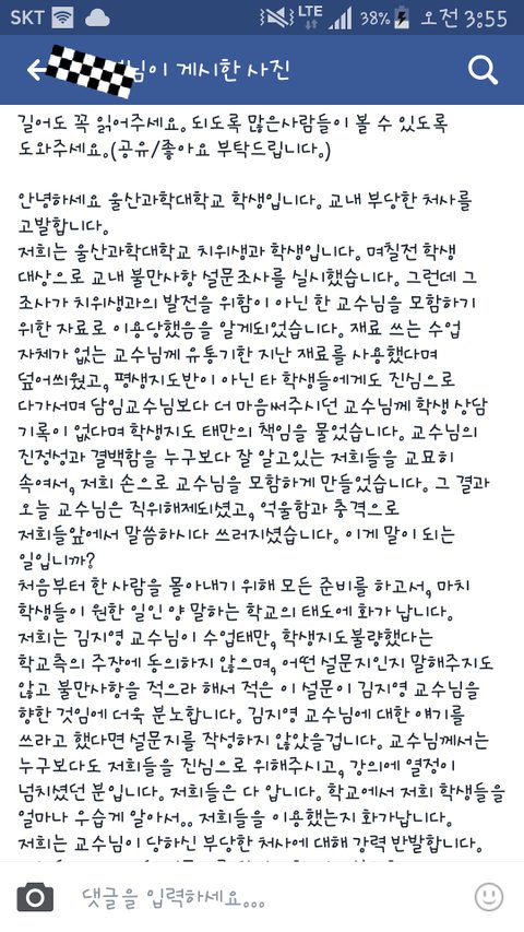 그런데 더 중요한건 지금 이것이 끝이 아니라 당장 다음주 월요일 징계위원회가 열린다고 해요... 변호사측에서는 학교의 여론 몰이는 끝이났고 언론으로 퍼트려야한다고 하는데... 학교 재단이 울산을 대표하는 h재단이라 그런지 ... 언론쪽을 다 막아주네요??