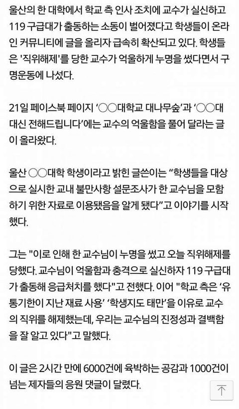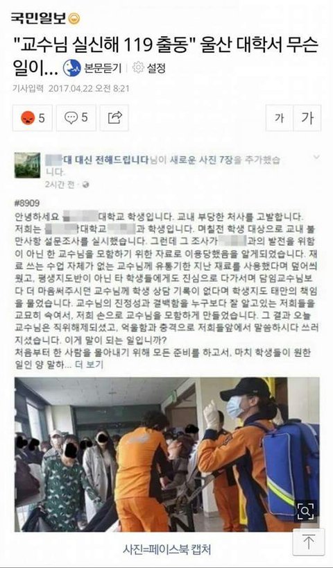 전말은 이랬다고 합니다 울과대 치위생과 학생들에게 학교의 발전을 말하며 설문조사를 받았다고 합니다. 이 설문조사지를 이용해 한교수님을 몰아가 직위해제를 시키셨고, 현재 쓰러지신지 16시간 가량이 지났으나 말한마디 몸한번 제대로 못움직이고 계세요...