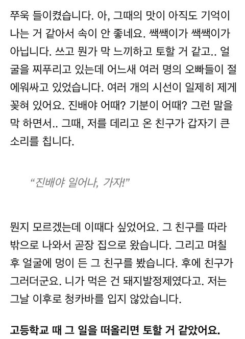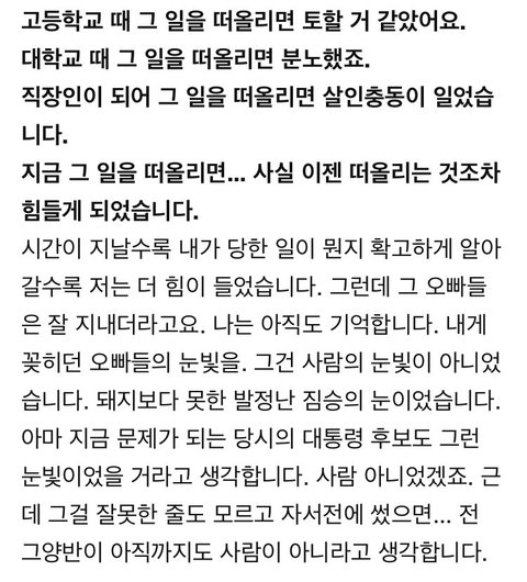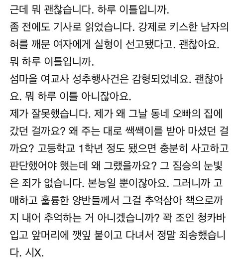 맨날 뭐만하면 여자도 그러거든욧! 하는데 이때까지 여자가 남자 술먹여서 강간하고, 몰카 찍고, 단톡에서 성희롱한 사건이 얼마나 있었냐? 성적 대상화 얘기만하면 여자도 그런다는데 양심이 있으면 그런 소리 못 하지. 단톡 성희롱도 이때까지 그렇게 많이 터졌는데 죄다 남학생들이었구만. 이러면 또 니들도 남자 식스팩 좋아하잖아 하는데 남자 웃통벗은 식스팩=여자 비키니지 누가 여자 비키니 보는걸로 뭐라하든? 진짜 식스팩보고 좋아하는거랑 성희롱, 몰카가 동급이라 생각하는거야? 이것들은 뇌가 없어.