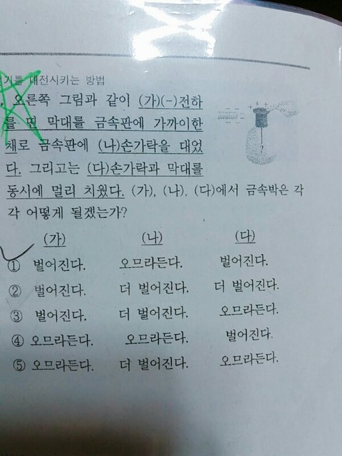 일단 ㅡ가ㅡ에서 금속박이 마이너스로 대전되서 벌어짐 그리고 -나-에서 플러스로 대전된 금속판에 손을대서 손의 전자가 금속판으로 이동하는거아님..? 왜 금속박이 오므라들어?