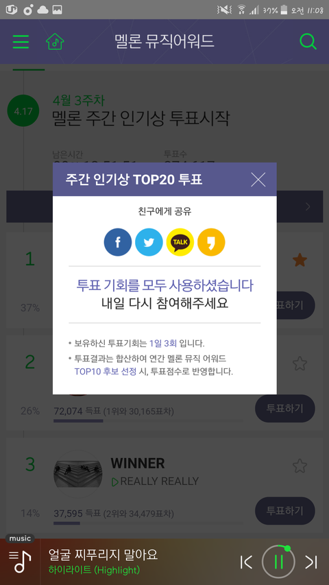 서수 11시차트 14위, 주간인기상투표하자