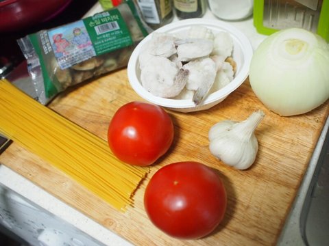 재료는 보시는바와 같이.. 요즘 마트에 저렇게 바지락 조금씩 넣고 천9백원. 토마토는 오늘 생토마토. 마늘. 양파. 해물믹스. 스파게티면.