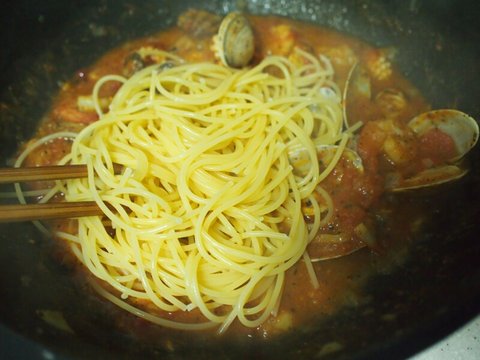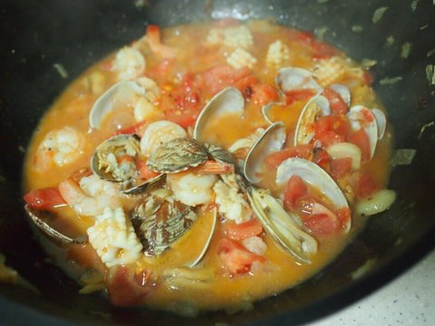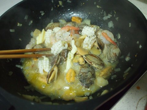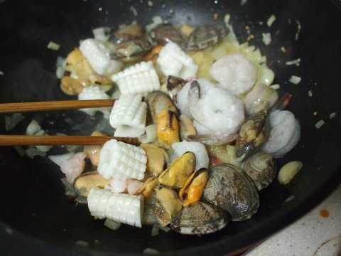 해물믹스와 깨끗이 씻은 바지락을 넣고 센불에 계속 볶습니다.