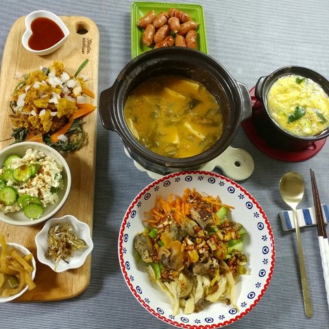 ㅎㅎㅎㅎㅎ이날은 뭔가 푸짐해보이는데...사실 다 잔반처리용이에요...ㅎㅎㅎ가운데는 시어머니가 꼬막 보내주셨는데 까먹었다가 생각이나서 급, 오이/버섯/당근 썰어서 꼬막 데쳐서 올리고 간장 양념장으로 마무리ㅎㅎ