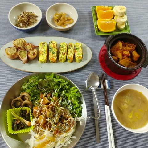 치킨 샐러드는 야식으로 불러먹고 남은...치킨에 깻잎깔고 올려주고ㅎㅎ나머지는 계란찜에 ㅎㅎ두부 샐러드도 며칠전에 된장찌개 끓이고 남은 두부 으깨서 오이랑 섞고 오리엔탈 드래싱 뿌려 주었어요ㅎㅎㅎ