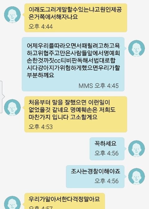 그러니 처음부터 말을 잘했으면 이런 일이 없었을 것 같다. 명예훼손은 자기도 마찬가지다 고소하겠다고 하네요