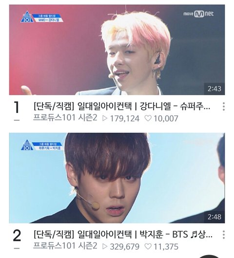 얘네 말고도 인기 있는 연습생들 영상 하트 수 1000~6000 그리고 순위권 영상 프듀가 쓸어먹음ㅋㅋㅋㅋㅋㅋㅋㅋㅋㅋ 처음 나왔을 때 1~20위 싹다 프듀 ㄷㄷㄷ