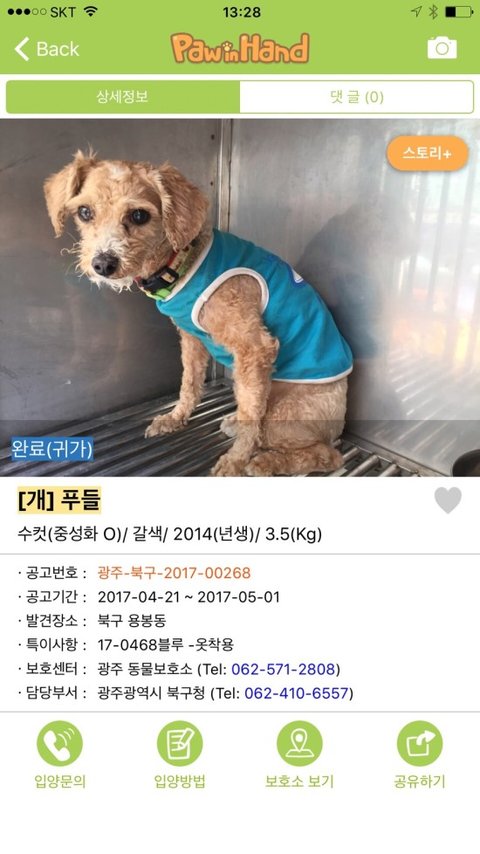 최근에 밤에 다니기 때문에 순돌이를 카페에 데리고 왔었어요. 점심 후 근처 산책을 시키는데 조그만 푸들 아이가 공사장에서 우리에게 달려왔습니다. 목줄이 있었지만 연락처가 없었어요. 위험한 곳이라 우선 데리고 와서 고민하다 보호자가 찾기 쉽도록 보호소에 보냈습니다. 보호소는 일정 기간(약 10일) 후 안락사 시키는 곳입니다. 마음이 너무 무거웠습니다. 계속 살펴보다 임시보호할 생각이었는데 완료(귀가)여서 너무 기쁩니다.