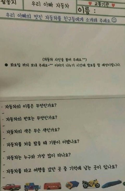 지겹게 올라온다고 하는데 우리 사촌동생 지금 8살인데 작년에 저거 방학숙제로 받아옴. 아빠랑 세차하고 차 사진찍고 별걸 다 쓰라고 되어있었음. 저거랑 거의 비슷한 형식인데 아빠랑 세차가 포함된걸로 기억함. 이모는 걍 그런가보다 했는데 나는 진짜 이해 안됐음.. 저런건 자주 올라와서 진짜 없어져야 한다고 생각함. 여전히 하는데가 있음.