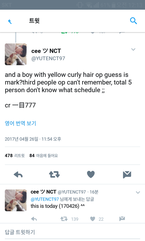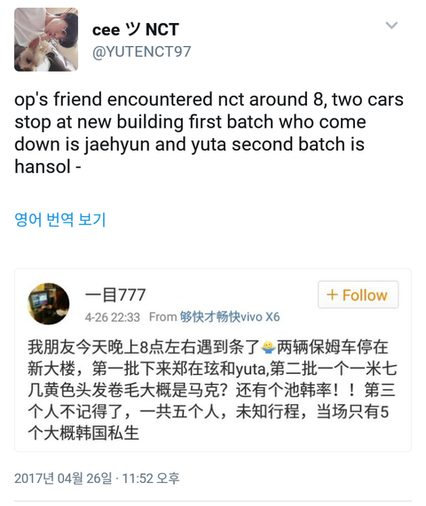 중국어해석) 8시쯤에 어떤 사람이 새로운건물?(스엠사옥인듯)에서 애들을 봤대. 차가 두대였는데 첫번째 차에선 재현 유타가 내렸고 두번째 차에선 키 170대 금발 머리가 내렸는데 마크인것같았고 지한솔도 있었대! 세번째 사람은 기억 안나고 총 5명이었대 비공개 스케줄이었고 현장에 한국 사생 5명정도 있었대