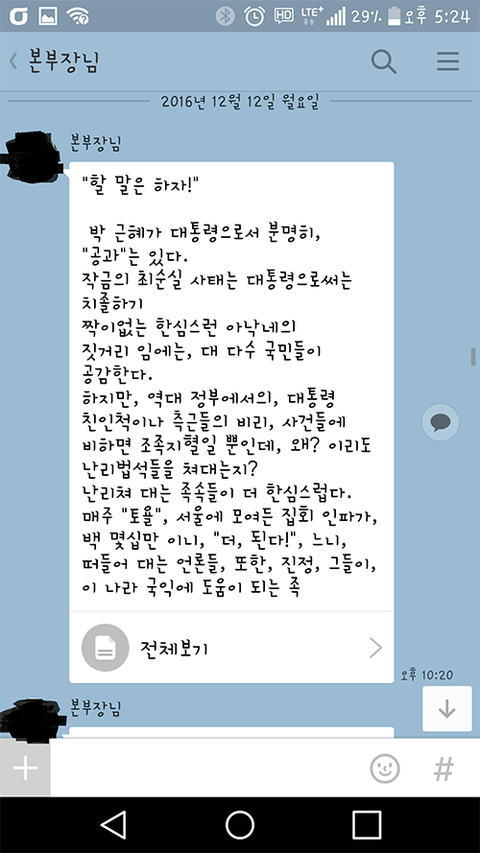 카톡은 그냥 씹고 대꾸도 안하고 있어요. 대표인데 뭐라고 대응하기도 뭐하고..출근하면 마주칠 직장상사와 카톡으로 토론할 배짱은 없고...ㅠㅠ 반박해봤자 어차피 위 일장연설의 반복이겠지만..
