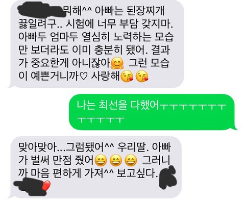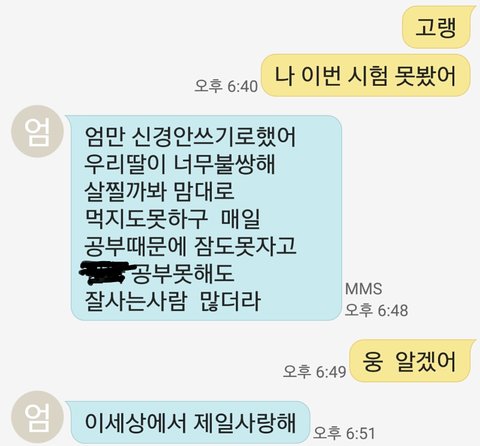 ㅎㅎ너 보닌깐 우리 아빠 생각난다 우리 아빠도 너희 어머님이랑 똑같으셔 나는 항상 과학이랑 수학때문에 너무 힘들어 했거든 불안감 때문에 많이 울기도 했고 평소에 인간관계 맺는것도 너무 힘들어서 요즘 계속 스트레스 받았는데 아빠가 아침마다 계속 문자보내줘서 요즘은 그거 보고 산다 우리 같이 힘내자!!❤️❤️
