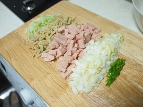 부엌이 좁고 그렇다보니까 도마에 썰때부터 순서대로 썰어놓으면 그냥 후라이팬에 순서대로 넣으면 됩니다. 재료를 잘게 썰어줍니다.
