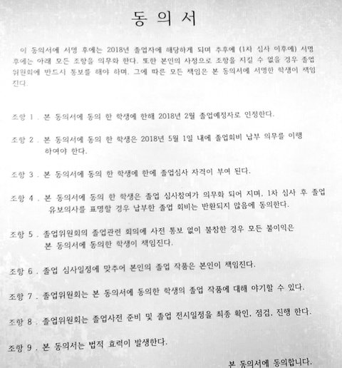 혹시 해서 작년에 졸업한 선배님들께도 자문을 구해봤지만 이러한 동의서가 나올만한 일은 일어나지 않았다고 합니다. 올 해에 갑자기 뜬끔없이 나타난 것이지요.
