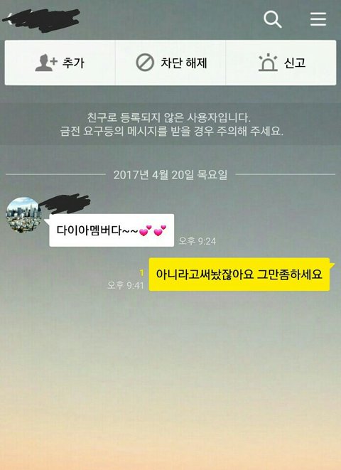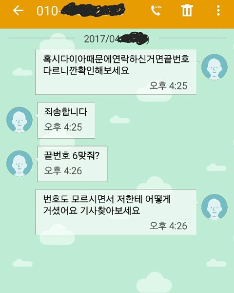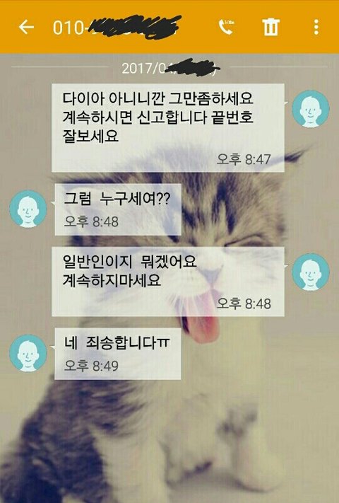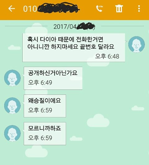 어느날 전화랑 문자가 엄청나게 오길래 주변 친구들이 번호를 바꾼건가? 하고 받았는데 받자마자 환호? 소리를 지르면서 "은채언니 팬이에요 언제 만날수있어요?"등등 어디사냐는 등 난리도 아니였어요 그래서 저는 "그런 사람이 아니다. 전화 잘못거신거 같아요"를 말했는데 갑자기 욕이...날라오더군요 그뒤로 끊자마자 문자로욕 또 다른사람이 전화와서 아까와 반복..반복 안받으면 받을때까지 계속 걸어오고 받아서 "여보세요?"하면 실실 웃으면서 끊고 .;그러다 이게무슨일이지? 하면서 집으로 와서 인터넷 검색하니 다이아 라는 그룹의 은채라는 사람이 번호를 공개했는데 뒷자리 한자리만 빼고 저랑 일치하는거에요ㅠ 덕분에 늦은 밤에도 계속 전화 보톡 단체톡초대 가 계속오고 새벽5시6시에도 전화와 문자가 오더라고요 또 계속 전화랑 톡이오니 충전도 빨리빨리 될리없고 출근시간은 가까워지는데 폰이 충전이...;겨우 충전하고 나와도 계속 전화오니깐 100%였던 폰이 4시도 안되서 50%이하로 떨어지고...친구랑 전화도 제대로 못하겠더라구요 전화걸려고 하면 계속 다른 전화가 오고 친구랑 통화하면 대기전화가 엄청오고 짜증나서 회사에 연락해봤지만 전화를 받지않거나 받아도 나몰라라 하더라고요 속상해요 알지도 못하는 그룹때문에 짜증나는 날들을 보내고 있어요 당장 번호를 바꿀수도 없는상황이라 속상하고 또 속상해요 평생들을까 말까한 욕을 요즘 많이 듣네요 모르는 사람들한테.. 저말고 다른 피해자분들도 많이 계시던데 힘내세요♡ 더이상 피해가 없길바래요시간이 약일꺼 같아요 긴글 어수선하게 늘어놨는데 읽어주셔서 감사합니다 2017년에는 다들 행복하고 건강하세요:)