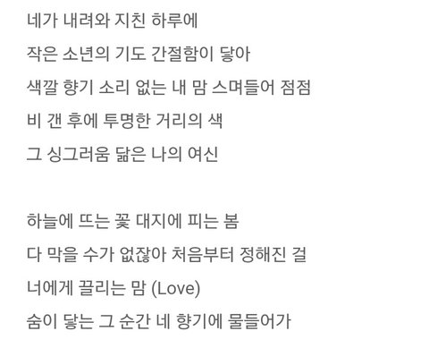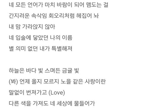하늘은 바다빛 스며든 금귤빛도좋지만 난 네모든언어가 마치바람이되어 맴도는걸 여기 들으면 막황홀함 네입술의닿았던나의이름 별의미없던내가특별해져 여기도 존좋