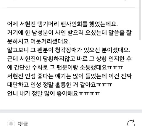 나 엊그제 코엑스갓다가 서현진팬사인회하길래 구경햇는데 인기많더라 사람 왜케많어ㅋㅋㅋㅋ 실물보니까 역시 연옌이구나.. 얼굴이 너무쪼그매 얼굴에 선함이잇더라 성격도좋은거같애 팬들 포옹 부담스러울수도잇는데 포옹해주고 악수해주고 옆에 무섭게생긴아저씨가 못하게 막던데 그래도 팬들 한명한명 손잡아주고 웃으면서 얘기하는데 심쿵햇음 청각장애가 잇으신 팬분이 왓는데 팬분이 수화를 하셧는데 당황하지않고 수화로 대화를 이어나가더라 진짜 된사람이구나 느꼇음 서현진도 수화라는걸 잘 모를텐데 팬을 위해 알고잇는 수화로 답을해줫다는게 정말 팬을 생각하는 마음이 이뻐보엿음 우연히 실물보고 급호감이라 찾아보니까 걸그룹밀크엿대 대박신기ㅋㅋㅋ 담주 무한도전 게스트로 나온다는데 본방사수해야지~