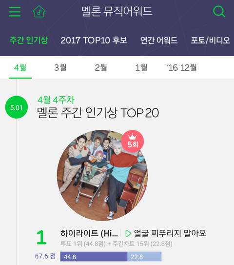 멜1론 주간인기상 5관왕 나이서~~!