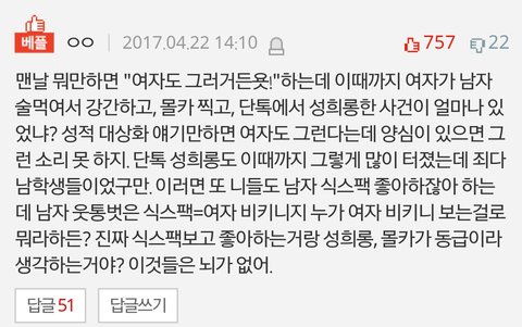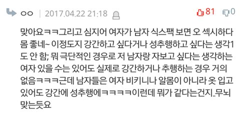 또 재범오빠 찌찌거리는 놈 있을듯한데 그여자 한명이 남자를 성적대상화했다해서 여자가 남자보다 성적대상화 더 당하는게 사실이 되진않음.