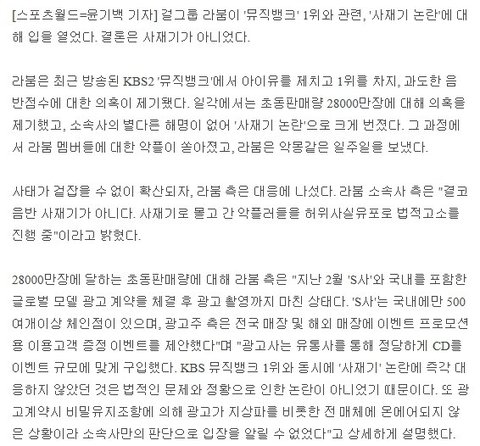 그래 소속사에서 사들인게 아니니 사전적으로 사재기는 아니겠지만, 실수요로 대중들에게 판매된게 아니라 광고한 계약사가 프로모션용으로 대량구매한거니까 2만8천장 까고보자면 사재기랑 '동급'이라는거야 소속사야. 이런해명 할꺼면 하질말지 걔네 1위하고서 자축하고 울고불고 난리였는데 그게 대중이 아닌 광고주작품이었다니 당사자도 민망, 보는이들도 민망..