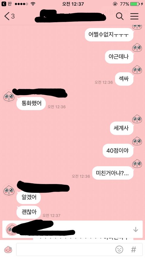 아니 세계사가 어떻게하면 섹싸가 되지 와 진짜 개쪽팔려 아무렇지 않게 넘겼지만 쟤 당황한 게 답 속도에서 느껴졌음 갑자기 멈칫 하더니 답하더라 아나 진짜 미친놈... 하 쪽팔려