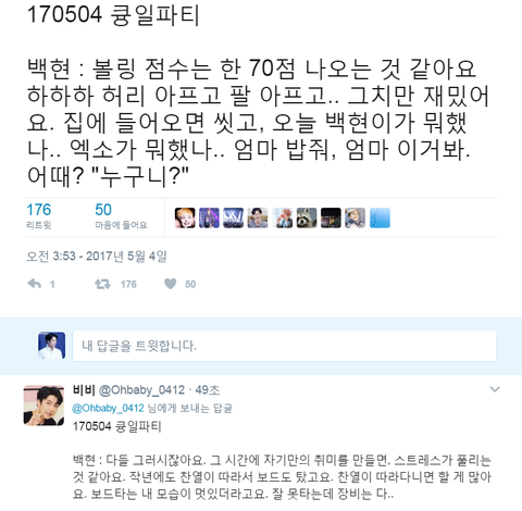저 위에 저말 말고도 누구니? 하니까 "엑소 백현이야~디오야~ 어때 잘생겼지? 노래도 잘해~ 다들 이러시잖아요." 막 이러궄ㅋㅋㅋㅋㅋㅋㅋㅋ핵 졸귀