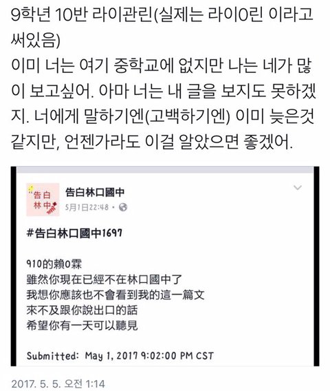 라이관린 대만 중학교 동창이 페북 대나무숲에 제보한 글인데 조카 설렘 ㅠㅠㅠㅠㅠ