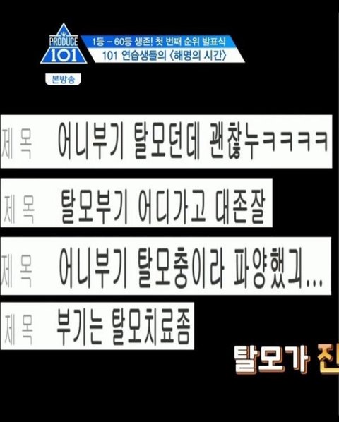 나도 연옌 글 극혐하긴 하는데 이거 ㄹㅇㅌㅋㅋㅋㅋㅋ 오늘자 프듀에서 이런 걸 그대로 방송에 내보냄 아마 프듀갤 같은데 충이랑 긔긔 거리는 걸 방송에서 볼 줄이야