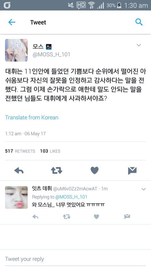 정말 사람이라면 이 트위터에 대해 공감하겠지요. 저번까지 대휘를 무차별적으로 비방하고 인신 공격 하고 온갖 욕설을 내뱉던 사람들이라면 자기 자신도 반성해야할 줄 알아야 한다고 생각합니다.