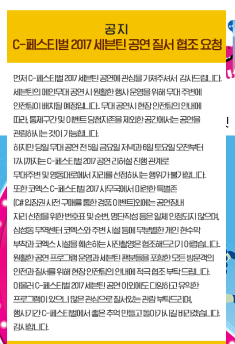 난오늘 거기 못가서 ㅠㅠㅠ 씨축제 공식 들어가니까 떠있더라구 못본애들 있을까봐 올려놓을게 세봉이들 무대 끝나고도 볼거많다니까 구경 재밌게들 하구와ㅋㅋㅋ 그리고 다치지말구 스탭들 말 잘듣구 세봉이들 안부끄럽게 잘 하고 오쟈!
