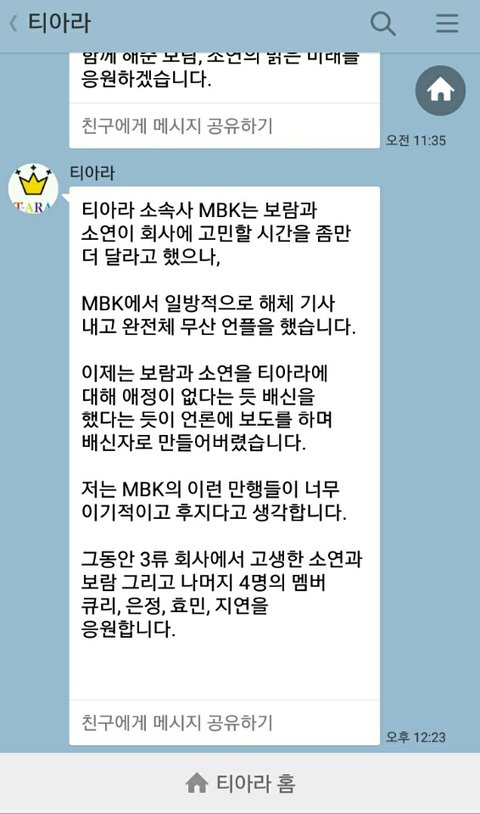 위 사진과 같이 멤버들은 시간을 더 달라고 하였으나 회사에서 무시하고 상의도 없이 탈퇴와 해체까지의 결단을 내려 기사를 냈습니다. 보람의 생일파티에서 보람은 팬들에게 회사는 나가도 절대 티아라에서는 빠지지 않겠다며 그 부분에 대해서 강조를 했으나 회사는 그저 자기들에게 유리한 방향으로 여론을 이끌었고 강제 탈퇴를 시켰습니다. 9년동안 자기 밑에서 열심히 활동한 사람에게 이렇게 대우를 한다는게 이해가 가지 않습니다...