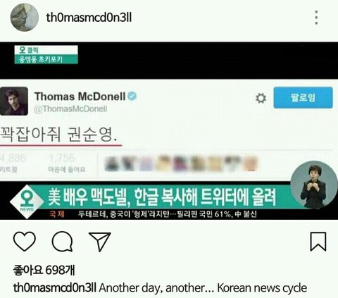 외국 영화배우가 '꽉 잡아줘 권순영' 라고 짹에 올림 - 한국에서 뉴스 보도 - 그 뉴스 보도 캡쳐본을 또 인별에 올림 ㅋㅋ 순영이도 이거 알려나?ㅋㅋㅋㅋ