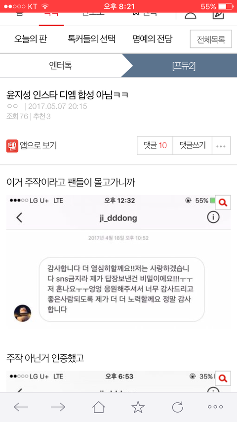 처음에 올린 사람이 다시 인증했다는데 뭐가 진짜인지 모르겠다ㅠㅠ 다른사람이 쓴거 캡쳐한거야