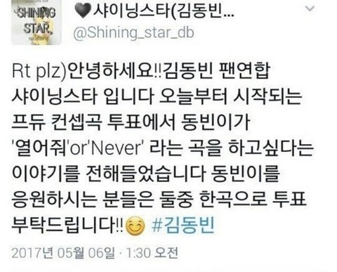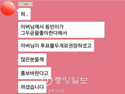 김동빈이 실제로 팬들한테 자신이 원하는 곡을 말하지 않았지만 김동빈 아버님이 팬들에게 김동빈이 원하는 곡으로 투표해달라고 부탁하셨다고 함. 아직까지는 김동빈이 자기 아버님한테 팬들에게 자기가 원하는 곡으로 투표해달라고 했는지는 모르지만 만약 혹시라도 김동빈이 이 사실울 모른다면 좀 억울할 듯. 워낙 베네핏이 15만표니깐 김동빈 아버님도 욕심이 나셨겠지... 그래도 다들 부정행위 좀 안했으면ㅠㅠㅠ