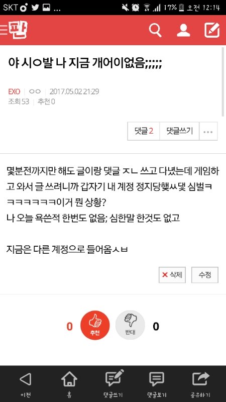 나 이 글 쓴년인데 오늘 또 정지먹었어 신발 왜 지랄이지 내가 네이트판에서 꺼졌으면 좋겠나 ㅅㅂ