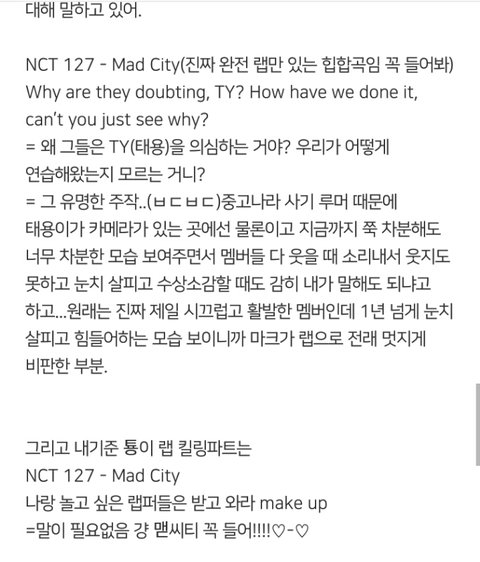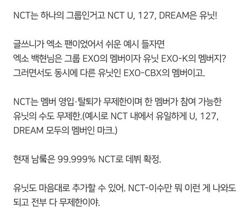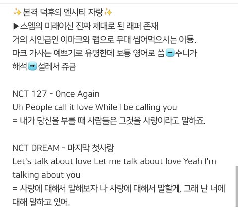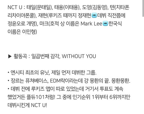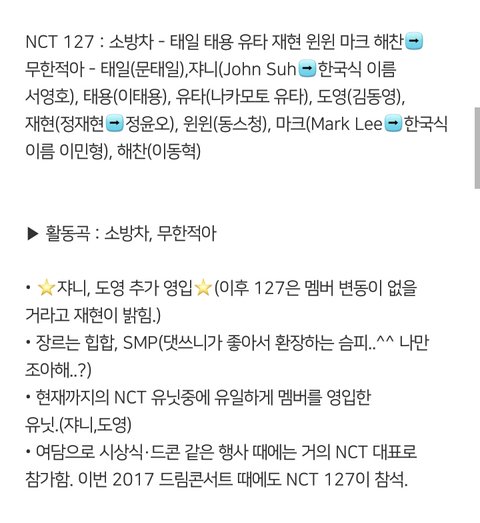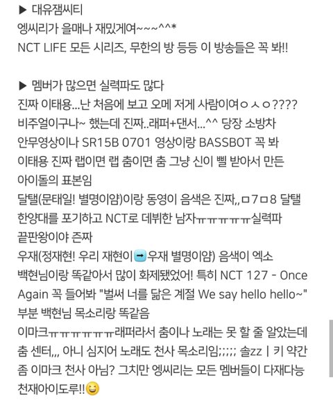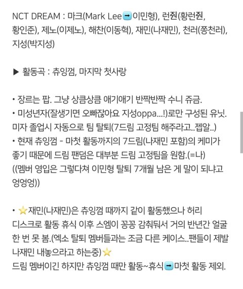 좀밑에 엔시티입ㅂ덕했단글에 어떤댓쓰니가 일케 다정리해놨더라구ㅜㅜㅜㅜㅜㅜ천사니 혹시???허락 맡아서 글올려!!공지밀자(아님말구...!!!!)