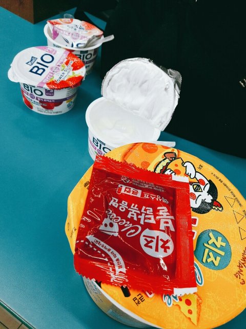 미방 (편의점에서 조신하게 요플레 먹다가 못참고 치즈불닭 먹은거 인증하는 사진)