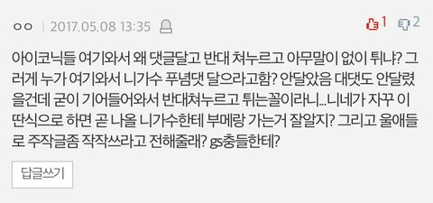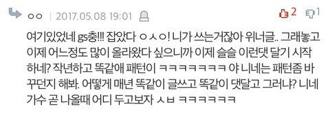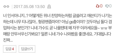 이런 식으로 댓글 좀 쓰지말자. 계속 그 때 일 말하면서 날카롭게 구는데 그런거 아니면 어떡할건데? 그리고 '니 가수 나오면 어떻게 되나보자'?; 가수 분들은 무슨 잘못이야... 심지어 대댓에 다른 인서가 기분 나빠하면서 진짜 인서면 인증하라고 하니까 인증도 안하더라. 만약에 팬톡하는 인서면 앞으로 이런 댓글 달지마.