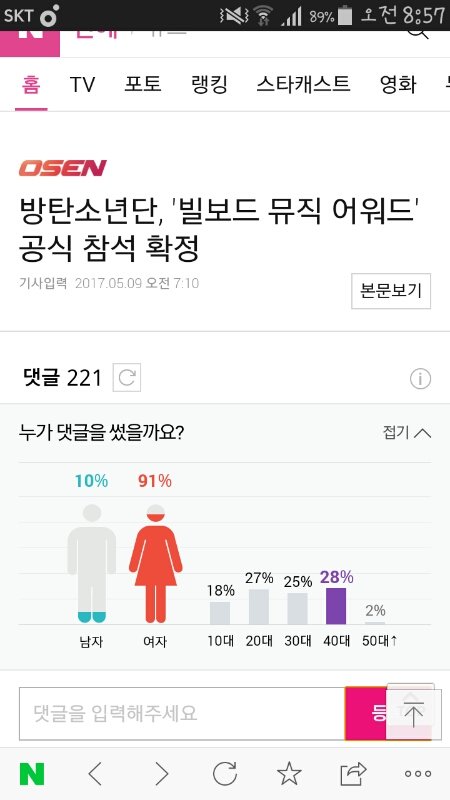 200개가 넘는 댓글중에 아직 악플이나 어그로 없고! 남자 비율도 10%, 40대 비율 28%ㄷㄷㄷ 다른 나이대도 비슷비슷하고ㅋㅋ 날이 갈수록 남녀노소 불문하고 팬이 늘어가네ㅠㅠ 진짜 기분좋다 오늘ㅠㅠㅠㅠ