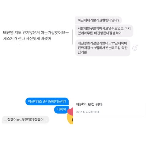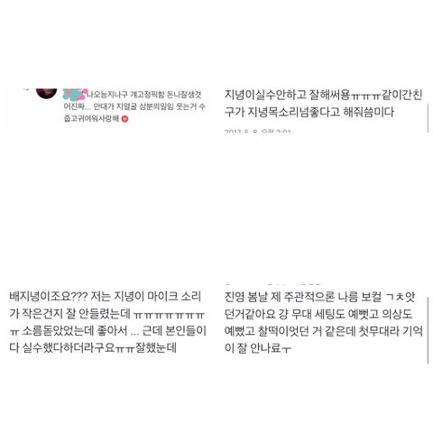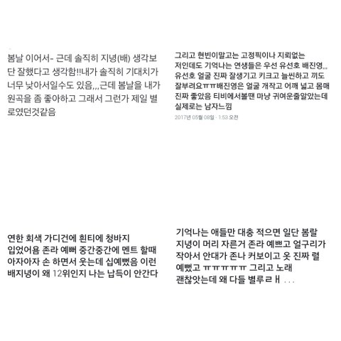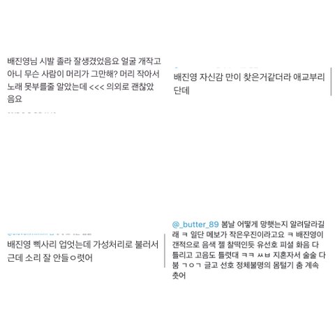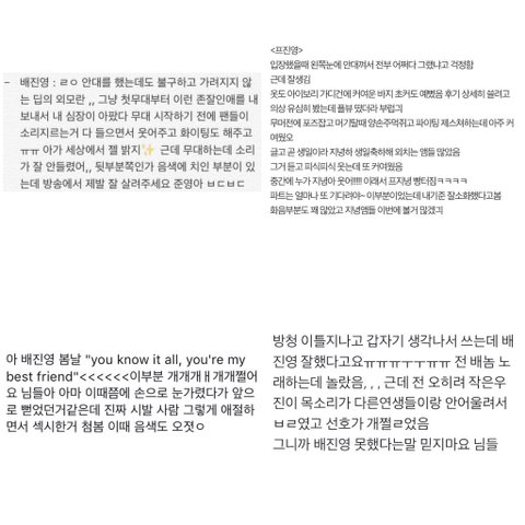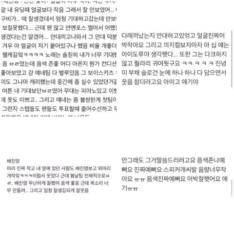 봄날조가 보컬조 중에서 젤 못했다고해서 걱정이 많음거같은데 진영이는 괜찮았나봐ㅠㅠㅠ 음색이 잘어울렷대ㅠㅠ 망하고 그런건아니고 평타한듯!! 괜찮아!!