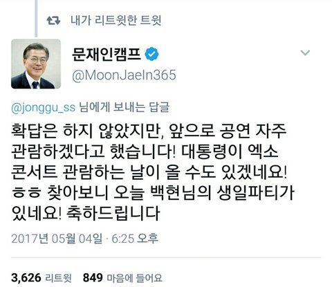 대통령되셧으니 만약 기회되서 오시면 아이도루 콘서트에 대통령가는거잖어 느낌다를듯 신기