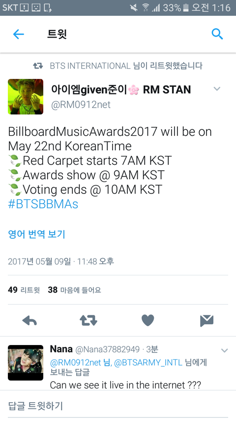 빌보드 생방송으로 보고싶은 아미들 있을까바 한국시간으로 언제 볼수있는지 갖고와쎃ㅎㅎㅎ