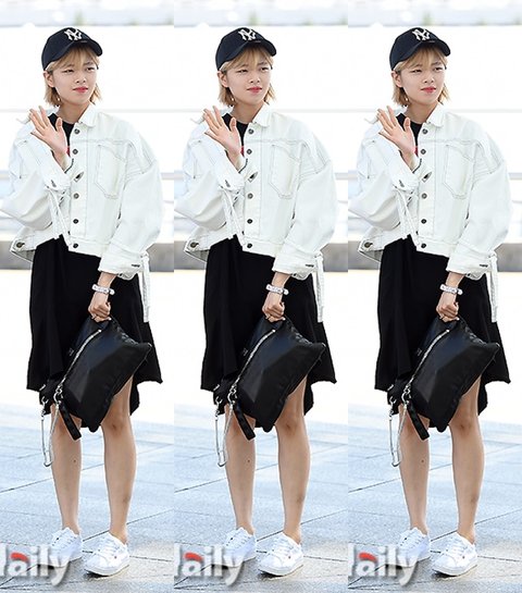 앤더슨벨 화이트 데님 자켓에 블랙 원피스 입고 손 흔드는데 넘나 상큼해서 심쿵사할뻔ㅠㅠ